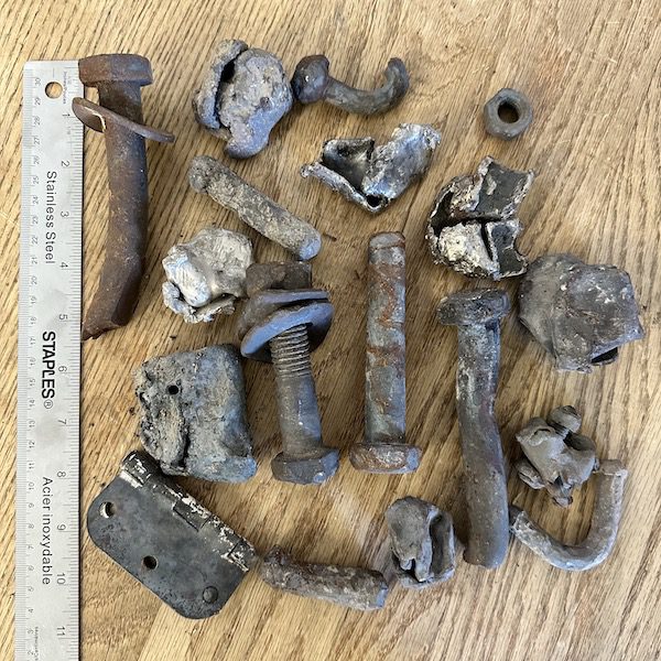 In addition to bolts and chunks of metal, the chip from the recycler also had other contaminants that ended up causing the ash to stick to the fire bricks and form large slabs of very solid (tarmac like) clinkers.
