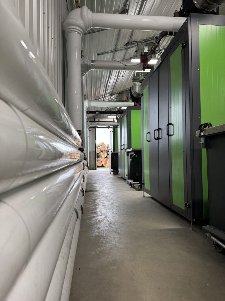Our boilers produce hot water which is easily transported via insulated underground piping to multiple buildings on the property with very little heat loss. If you are not on radiant heat, water to air heat exchangers can be used to transfer that heat to hot air if you have a forced air heating system