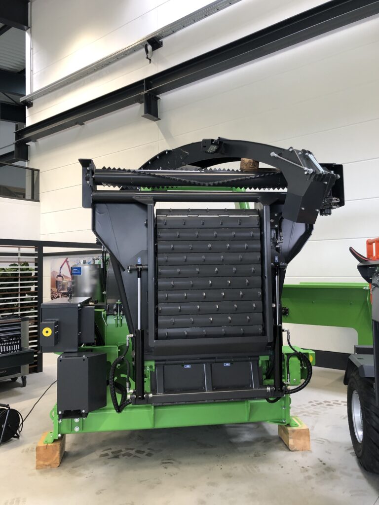 Working in conjunction with the conveyor table this hungry pressure roller is able to pull and crush tops and branches easily.