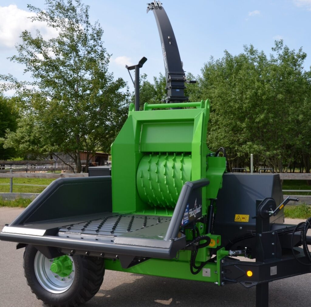 Like all Heizohack chippers, the feed system has a conveyor belt and a pressure roller to self feed anything you throw at it. This model also comes with a hydraulic roller at the tip of the in-feed table to help feed small logs.
