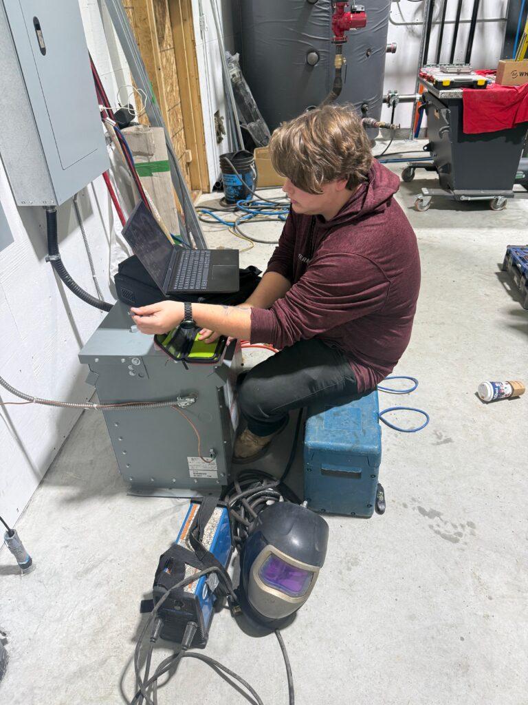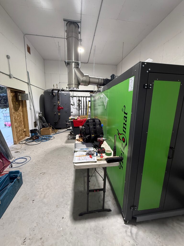 The boiler is fully automated. The waste wood material produced on site is chipped to a uniform size using the screened biomass chipper. They are then loaded into the bunker (fuel store) where an automated and robust auger system pulls them into the boiler’s fire chamber on demand. The boiler supplies heat through a glycol‑based radiant underfloor heating system, warming two factories, office spaces, and even outdoor slabs. In total, about 30,000 square feet are currently heated—and the system is already sized to handle future expansions without needing a major upgrade.